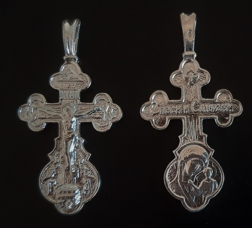Krzyżyk srebrny. Próba 925 Wymiary 22 x 35 mm (43 mm z uszkiem) Wersja ciemniejsza – oksydowana