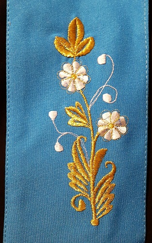 Zakładka wyszywana na obu końcach, zakończona złotymi frędzlami.